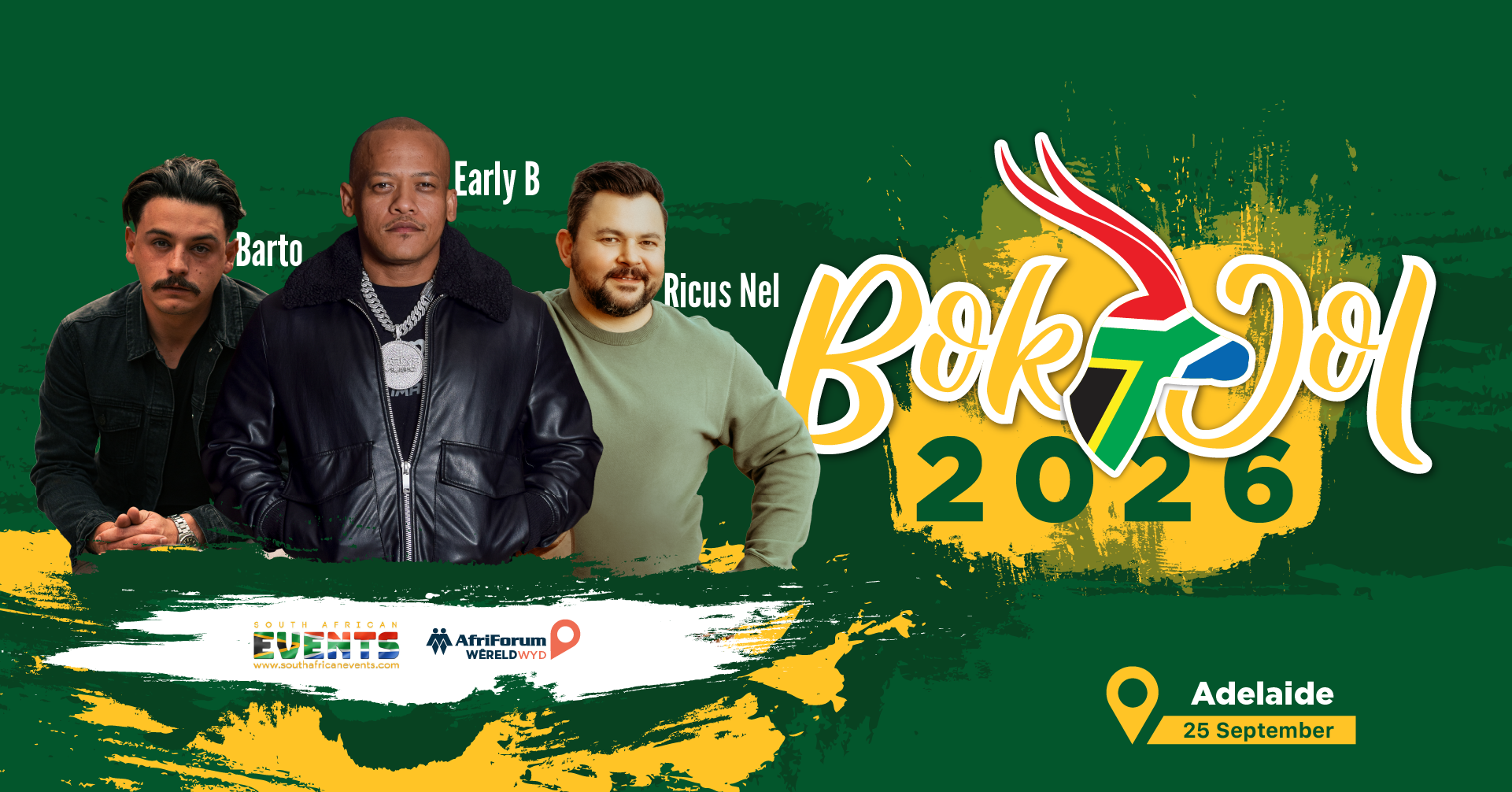 We are bring the rugby vibe to Adelaide in September with Early B, Ricus Nel and Barto Swiegers. Please share with all your friends and groups in Adelaide. Tickets will be available by end of April.